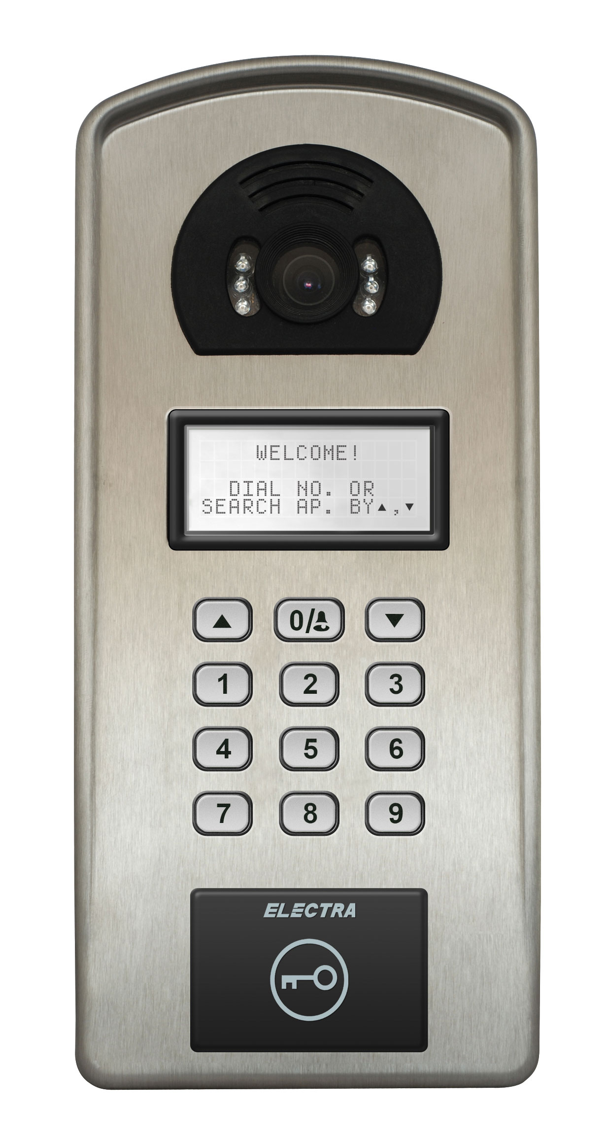 Carcasă din INOX, cameră video CMOS, 1/3”, 800 TVL, display electronic pentru listă locatari și afișare status utilizare, tastatură clasică iluminată, acces cu card RFID, gamă temperaturi funcționare -30…+80OC, montaj pe suprafață,